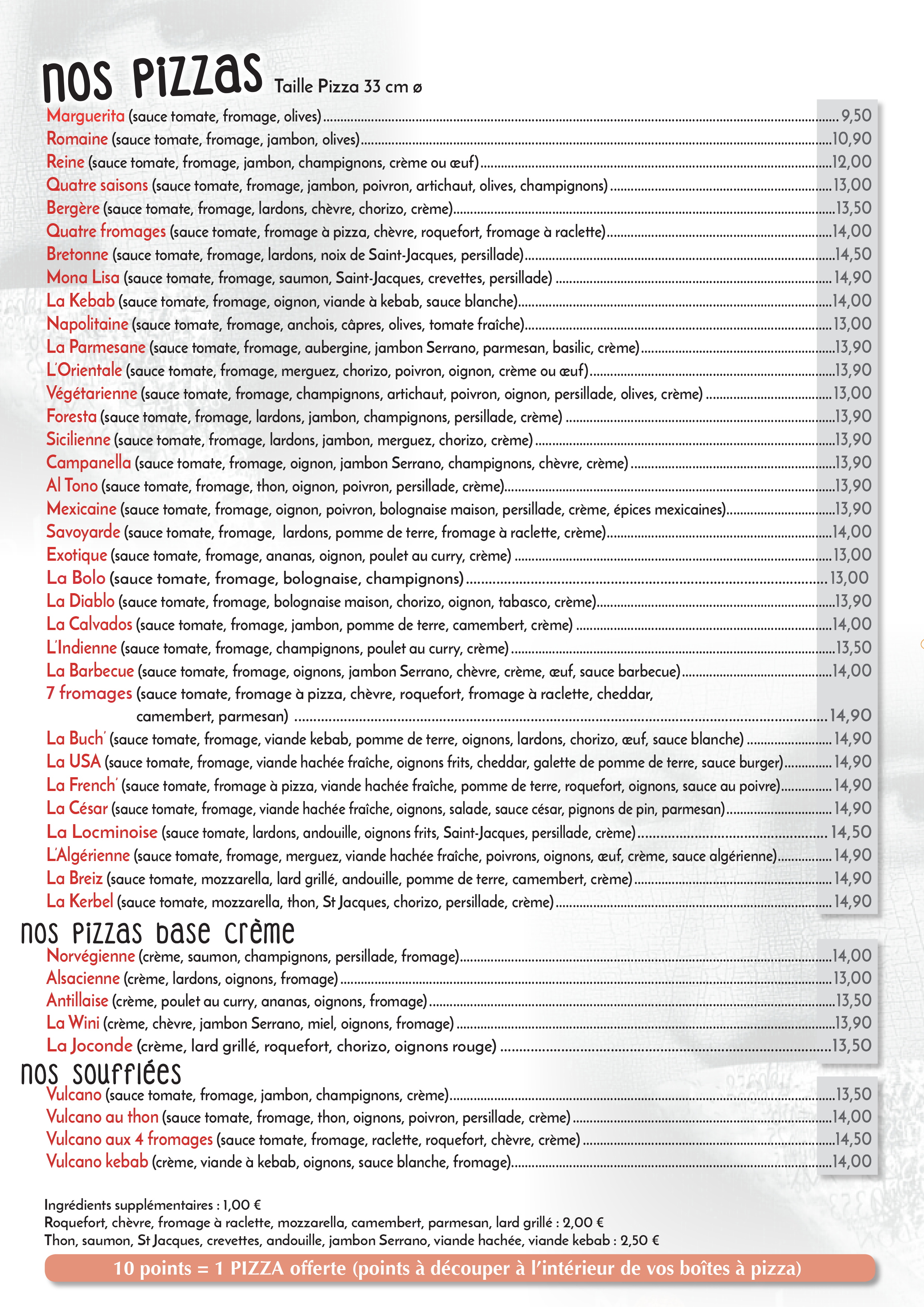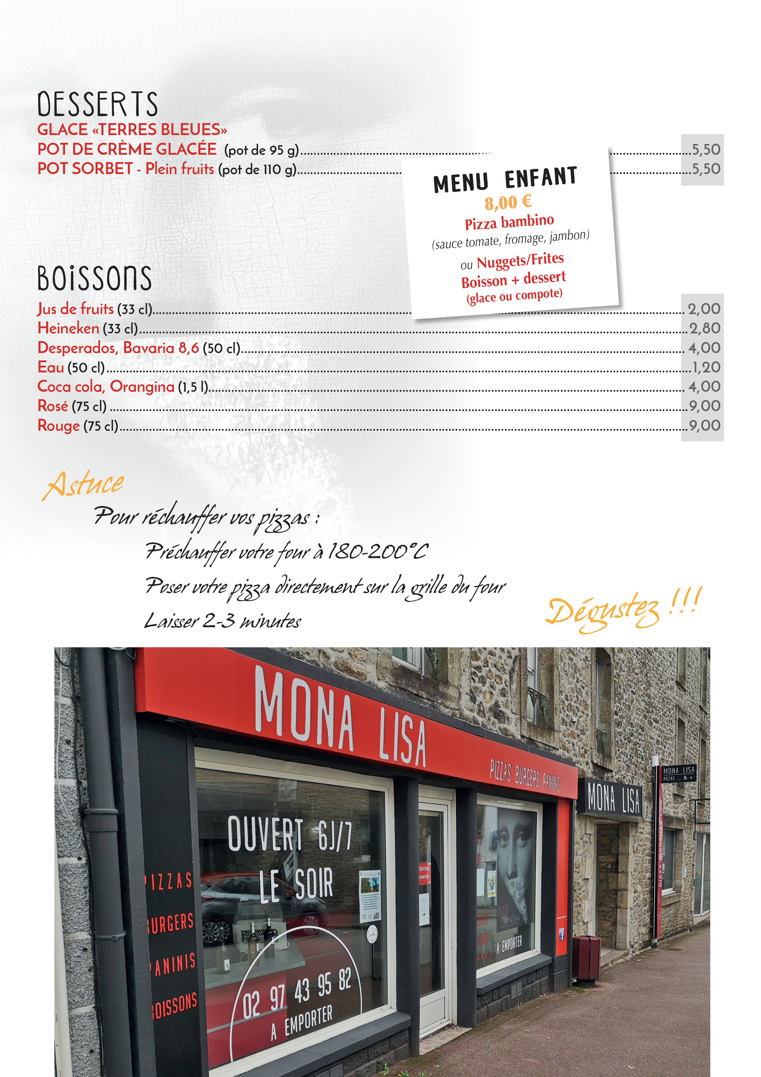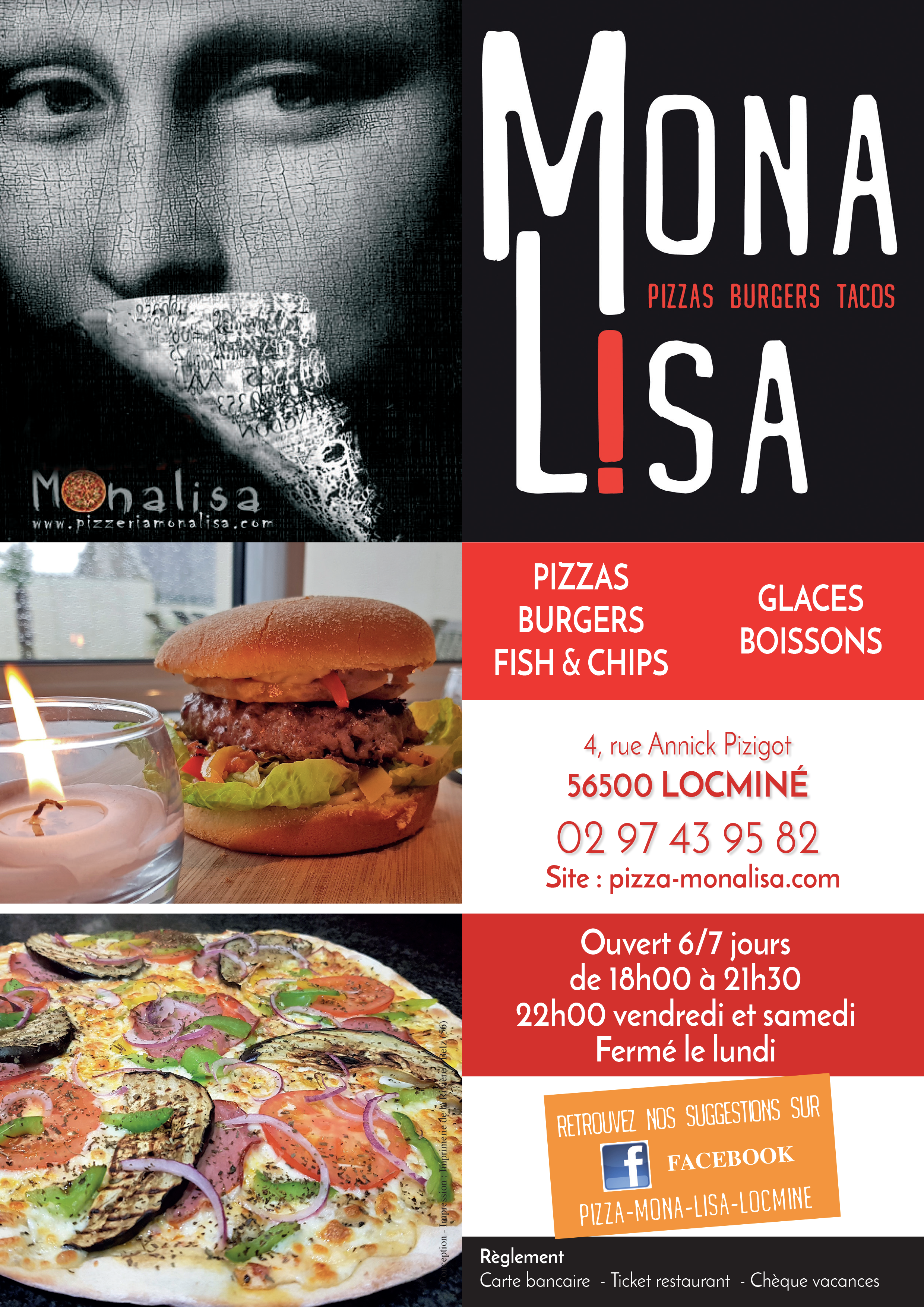 La carte de la Pizzeria Mona Lisa Locminé